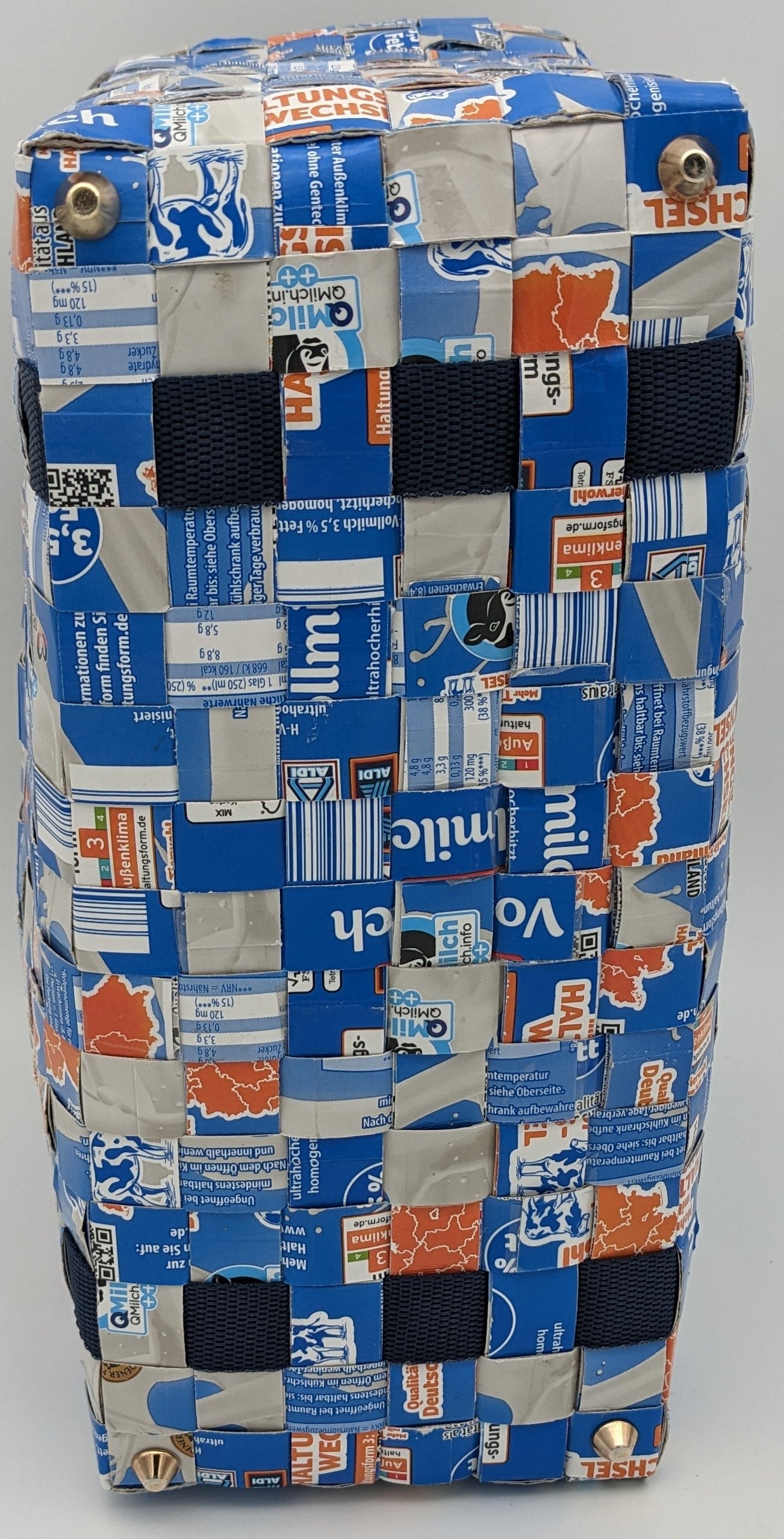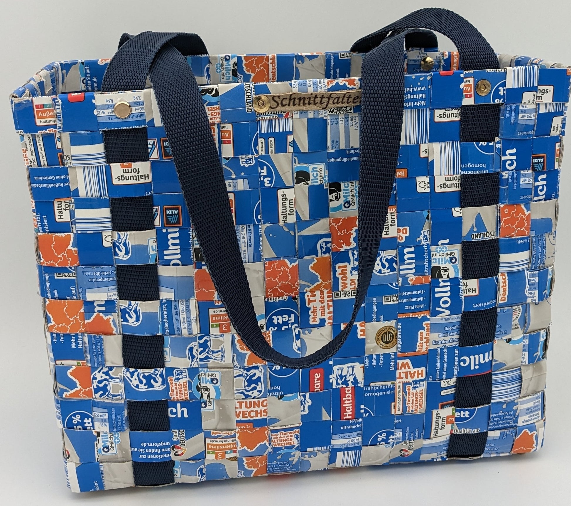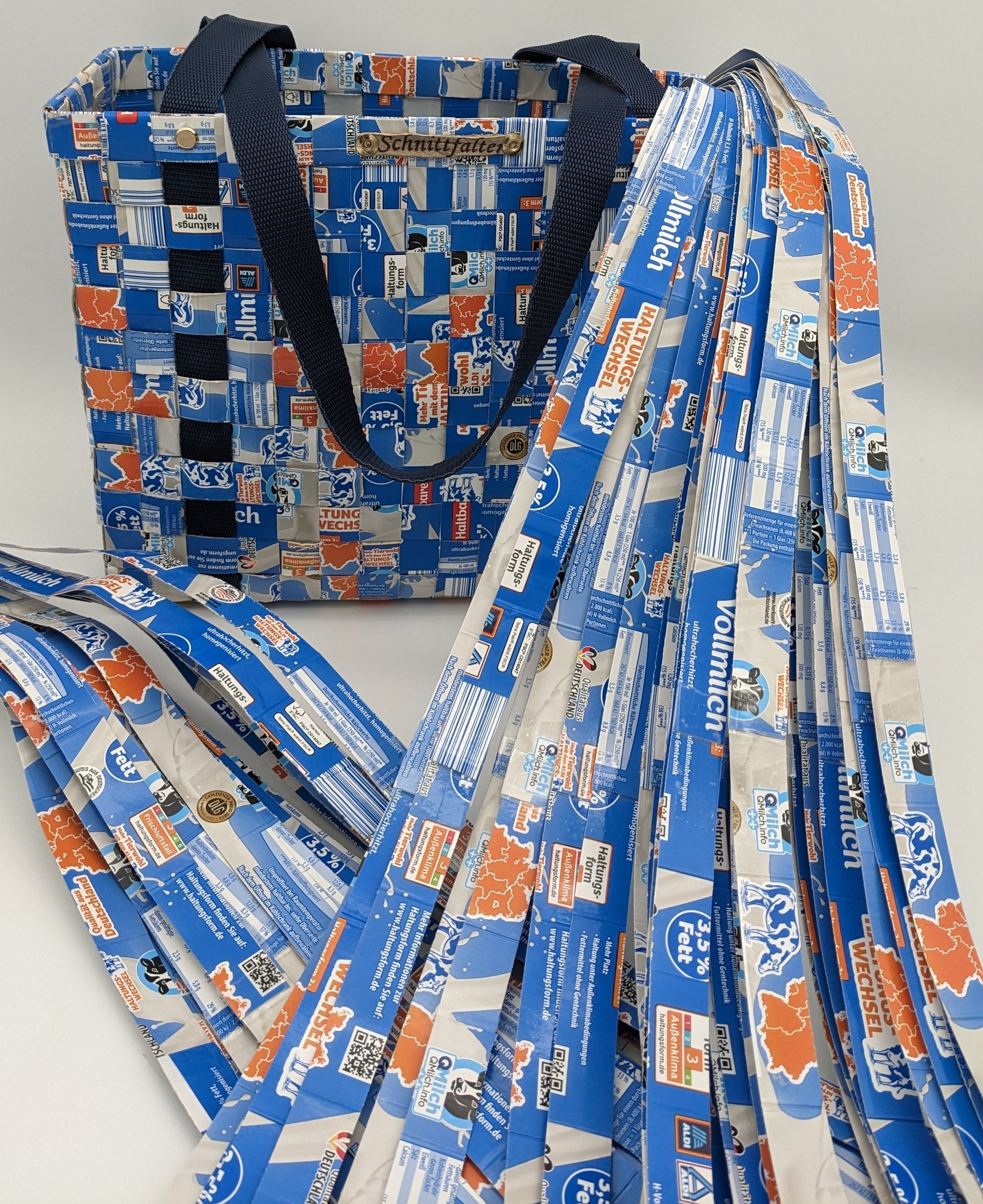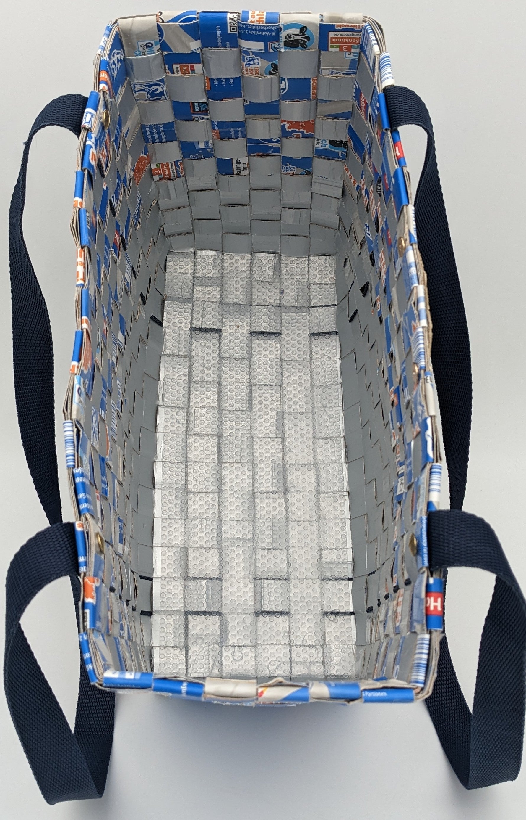 Die Tüten werden gereinigt, in Streifen geschnitten, sorgfältig miteinander verbunden und zu einem stabilen Muster geflochten. Das umlaufende blaue Gurtband (73 cm) macht sie angenehm über der Schulter tragbar, Taschenfüße sorgen für einen trockenen Stand, selbst wenn der Boden mal feucht ist. Im Inneren befindet sich eine praktische Antirutschmatte, die verhindert, dass dein Einkauf verrutscht. Sollte die Tasche durch einen größeren Einkauf an Form verlieren, lässt sie sich dank der Schrauben am Gurtband ganz leicht wieder richten.