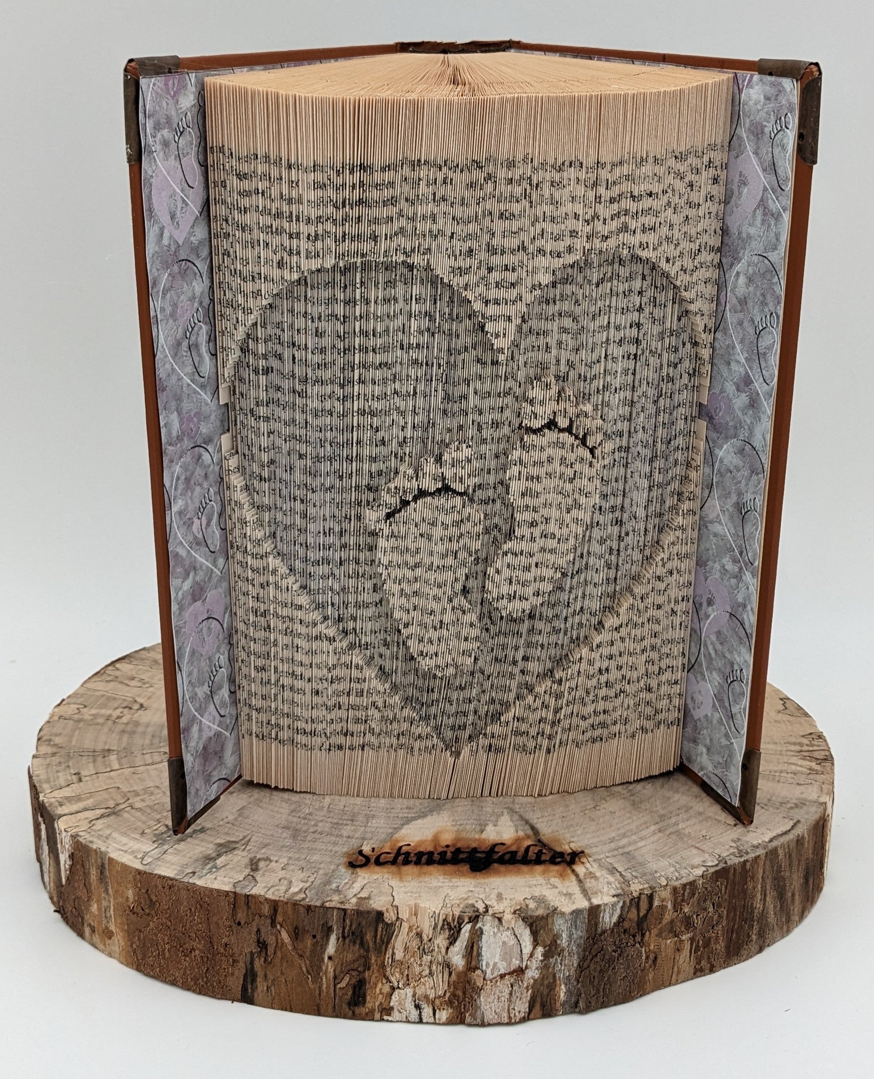 Dieses besondere Kunstwerk aus einem alten Buch besticht durch seine liebevoll gefalteten Babyfüße in 3D-Optik, die in eine Herzform integriert sind. Jede Seite wurde sorgfältig von Hand gefaltet, um ein detailreiches und berührendes Motiv zu schaffen. Dieses einzigartige Stück eignet sich perfekt als Geschenk zur Geburt, Taufe oder als besondere Erinnerung für Eltern und Großeltern.