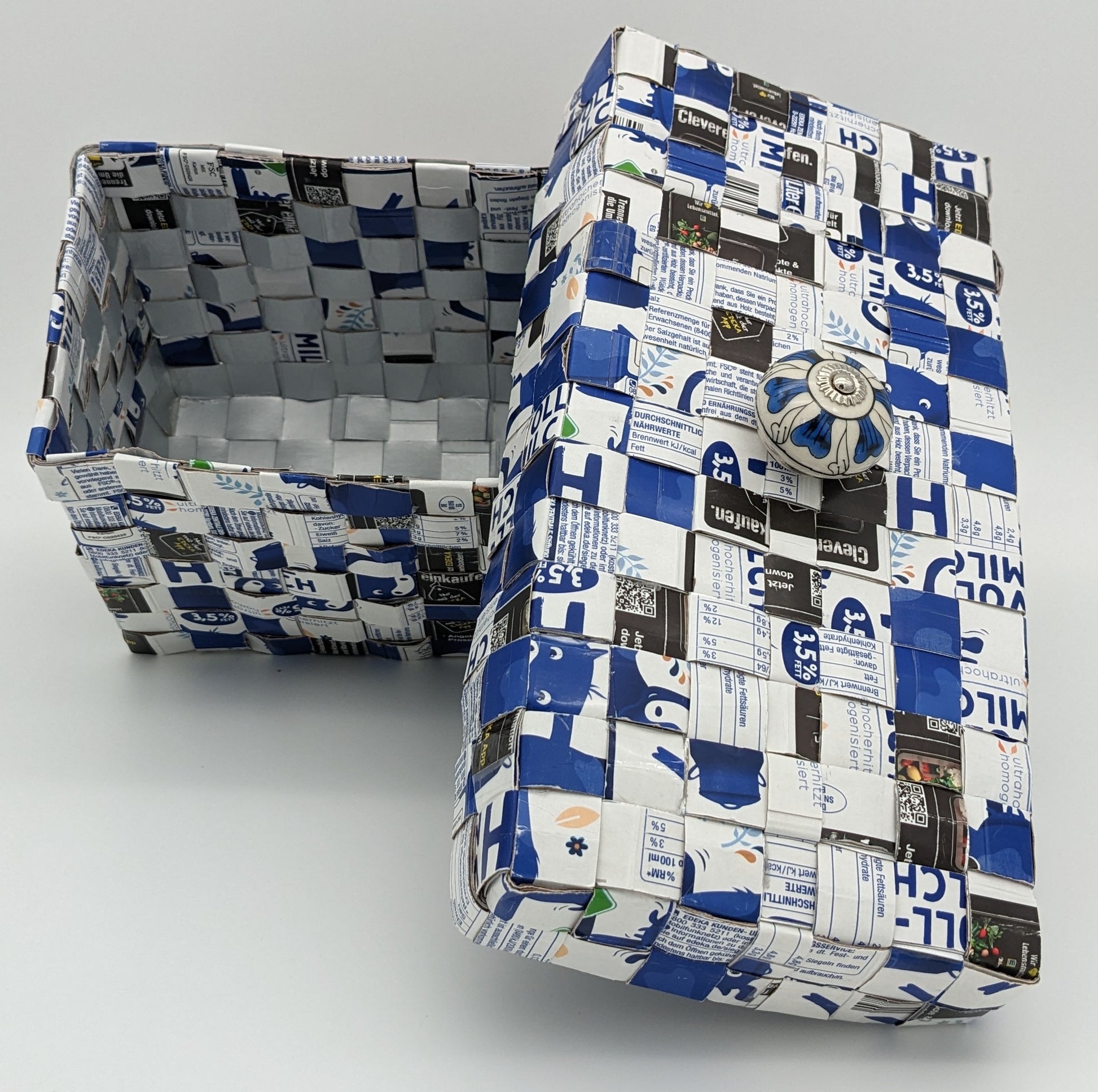 Entdecken Sie ein einzigartiges Handwerksstück: ein vielseitig einsetzbares Utensilo, hergestellt aus recycelten Tetrapack-Milchtüten. Jedes Utensilo ist sorgfältig handgefertigt und ein Unikat, das Ihren Raum mit Stil und Nachhaltigkeit bereichert.