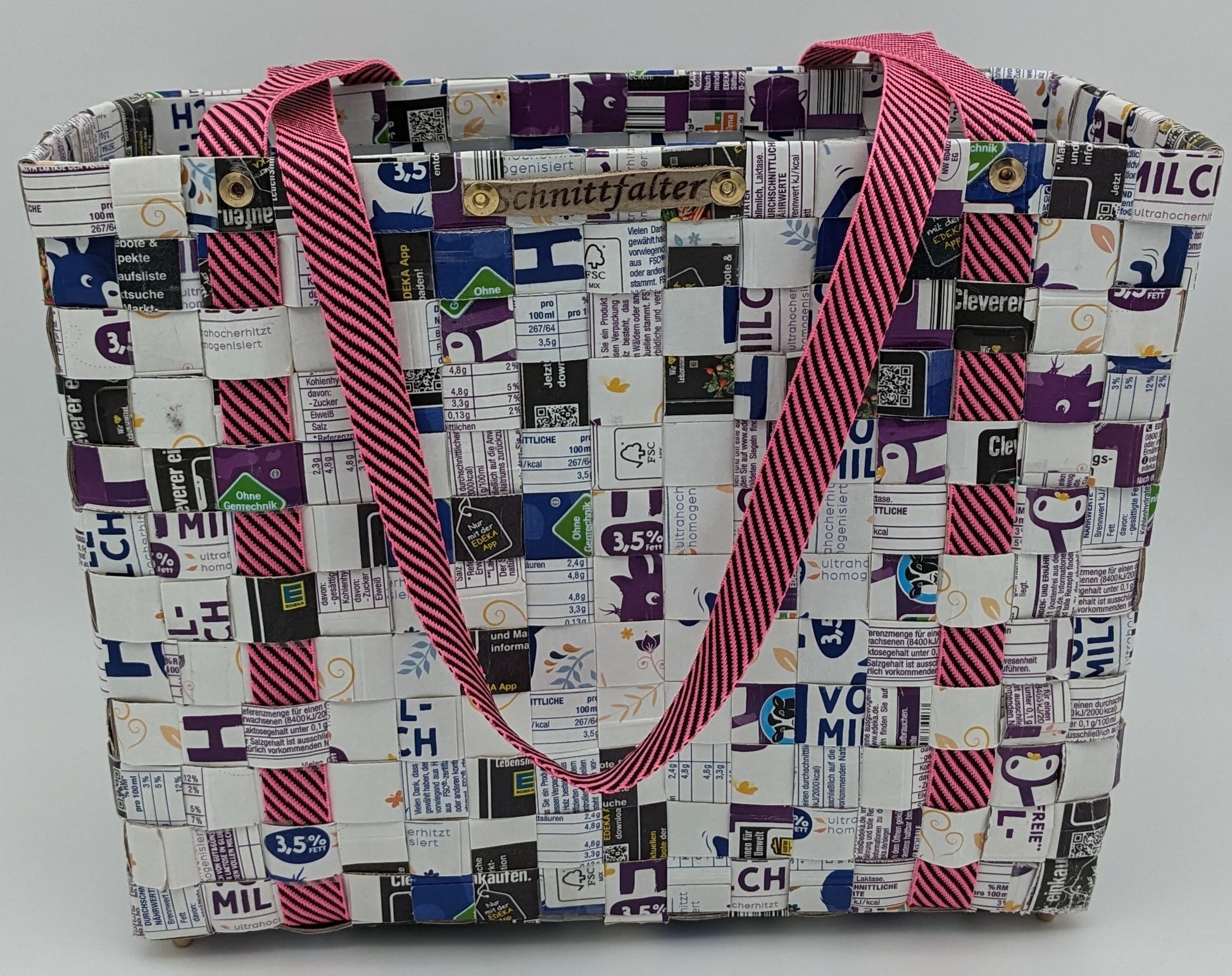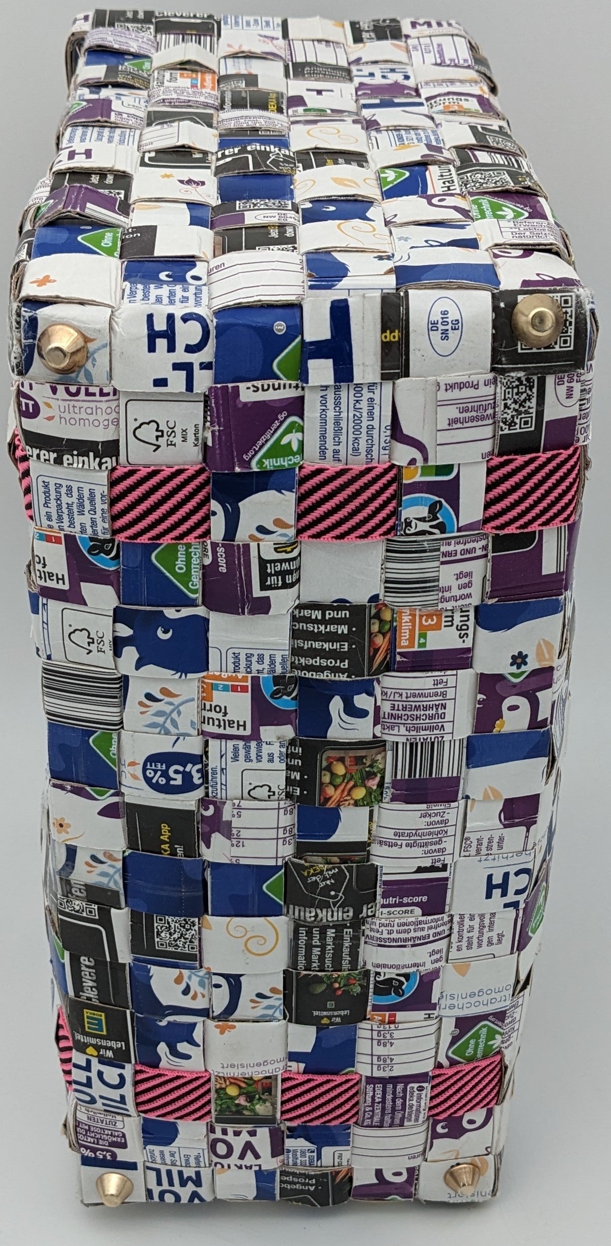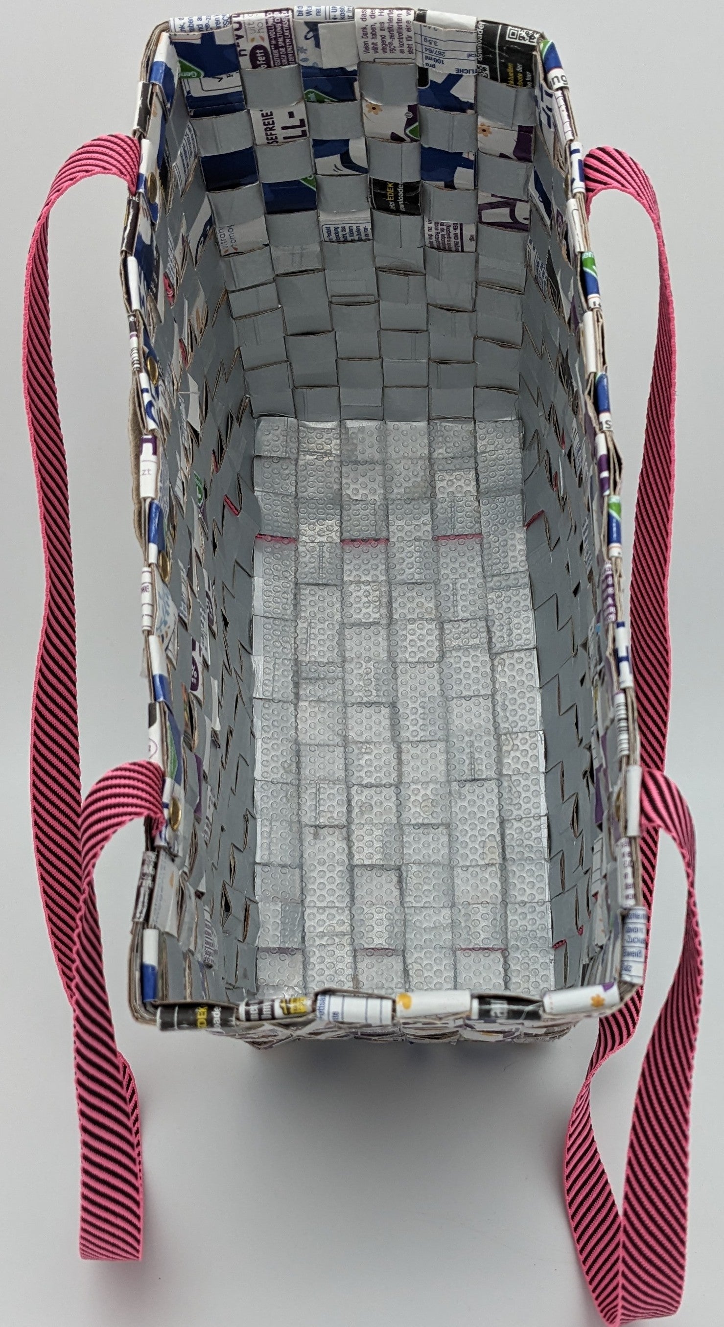 Diese Upcycling-Einkaufstasche wird aus zweifarbigen Tetrapack-Resten gefertigt, die von mir sorgfältig gereinigt, geschnitten und verflochten werden. So entsteht ein praktischer Begleiter, der zeigt, dass Nachhaltigkeit und Design perfekt zusammenpassen.