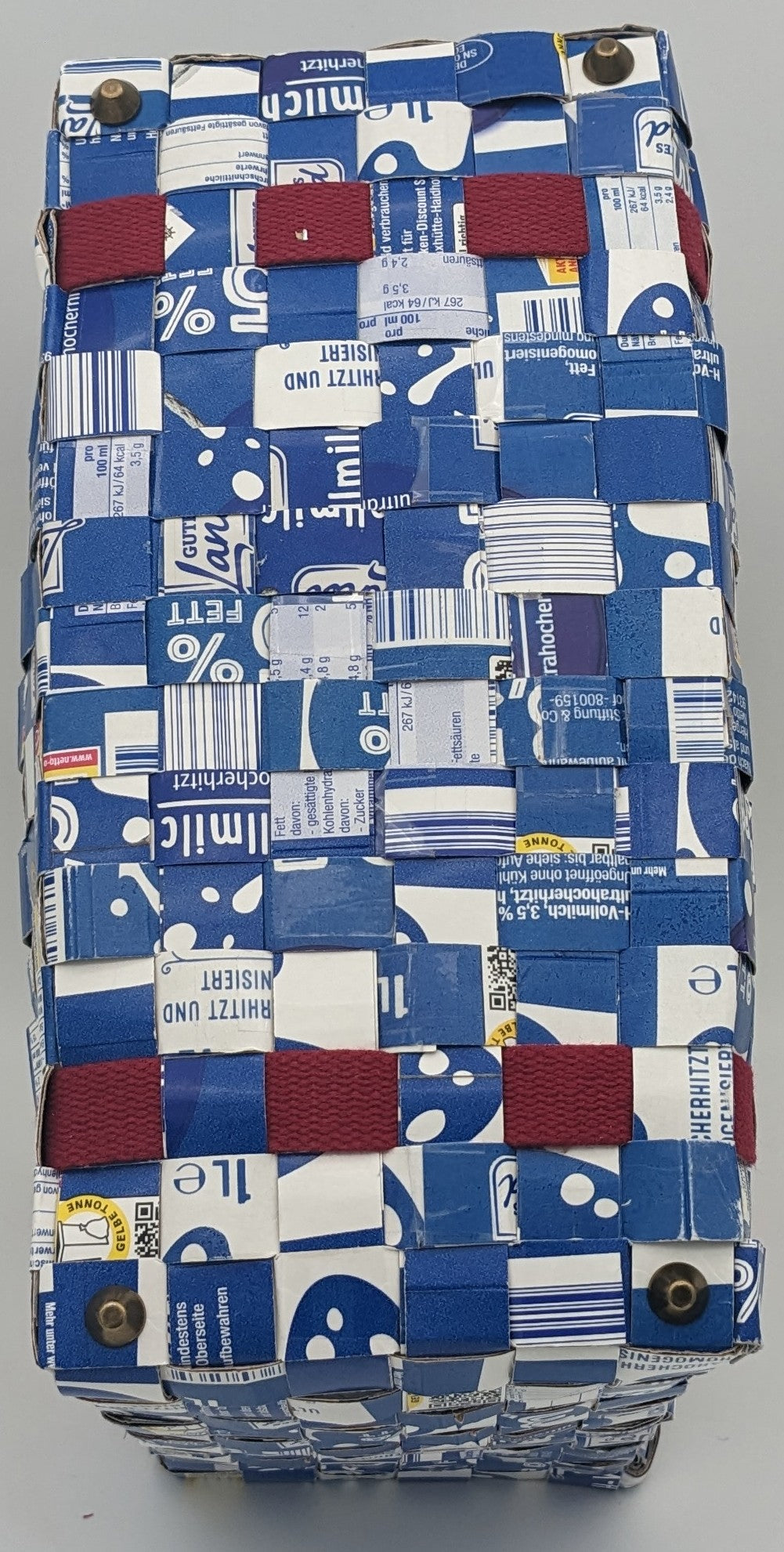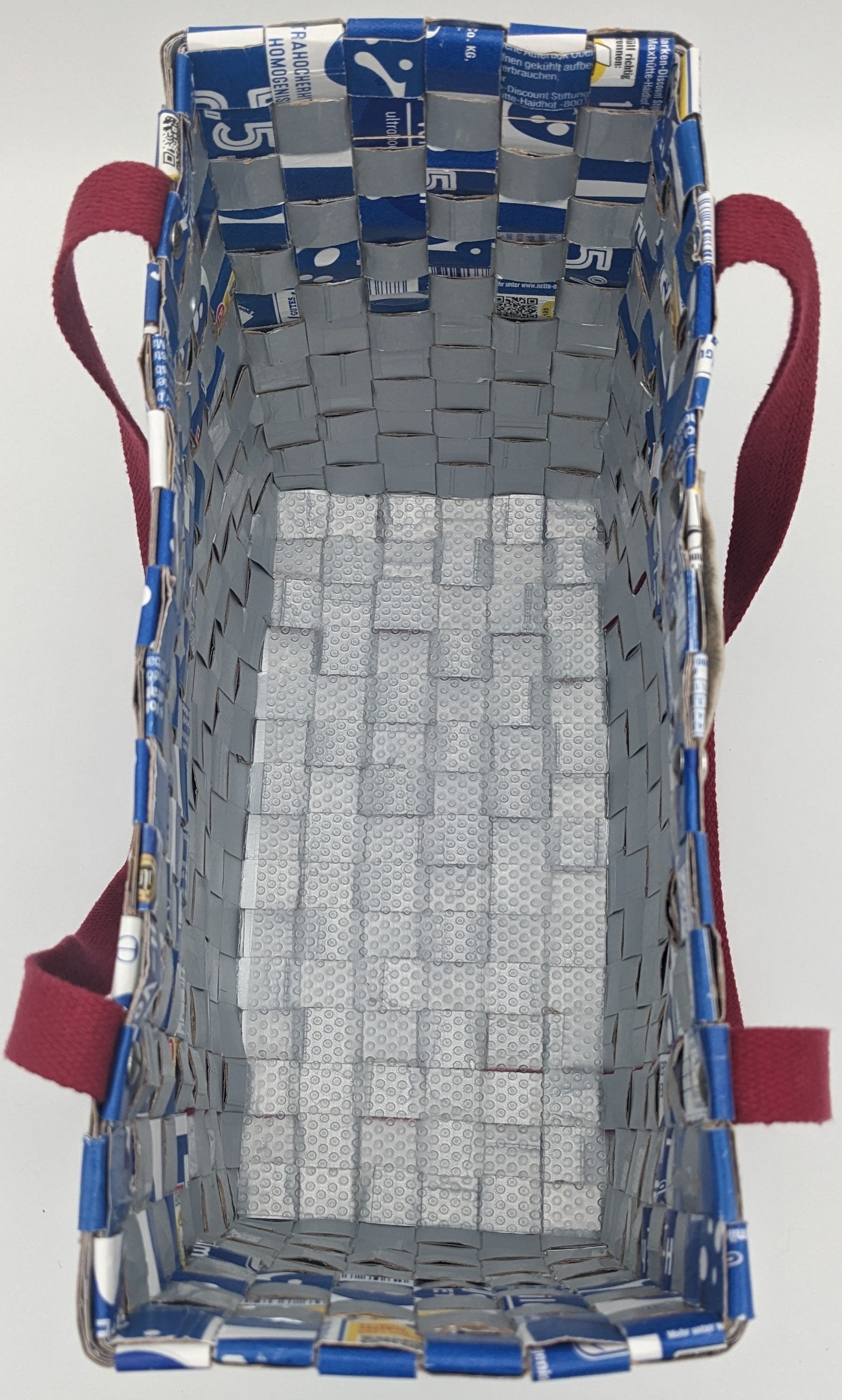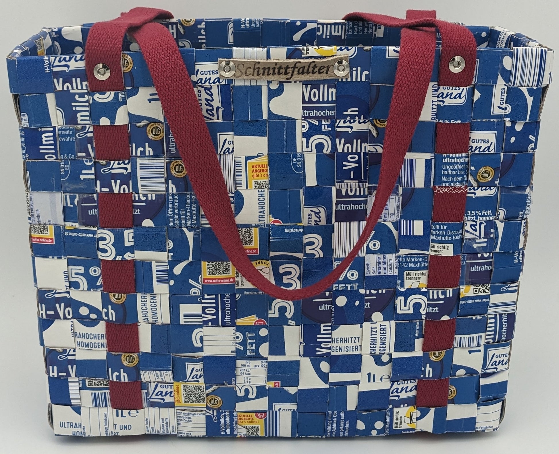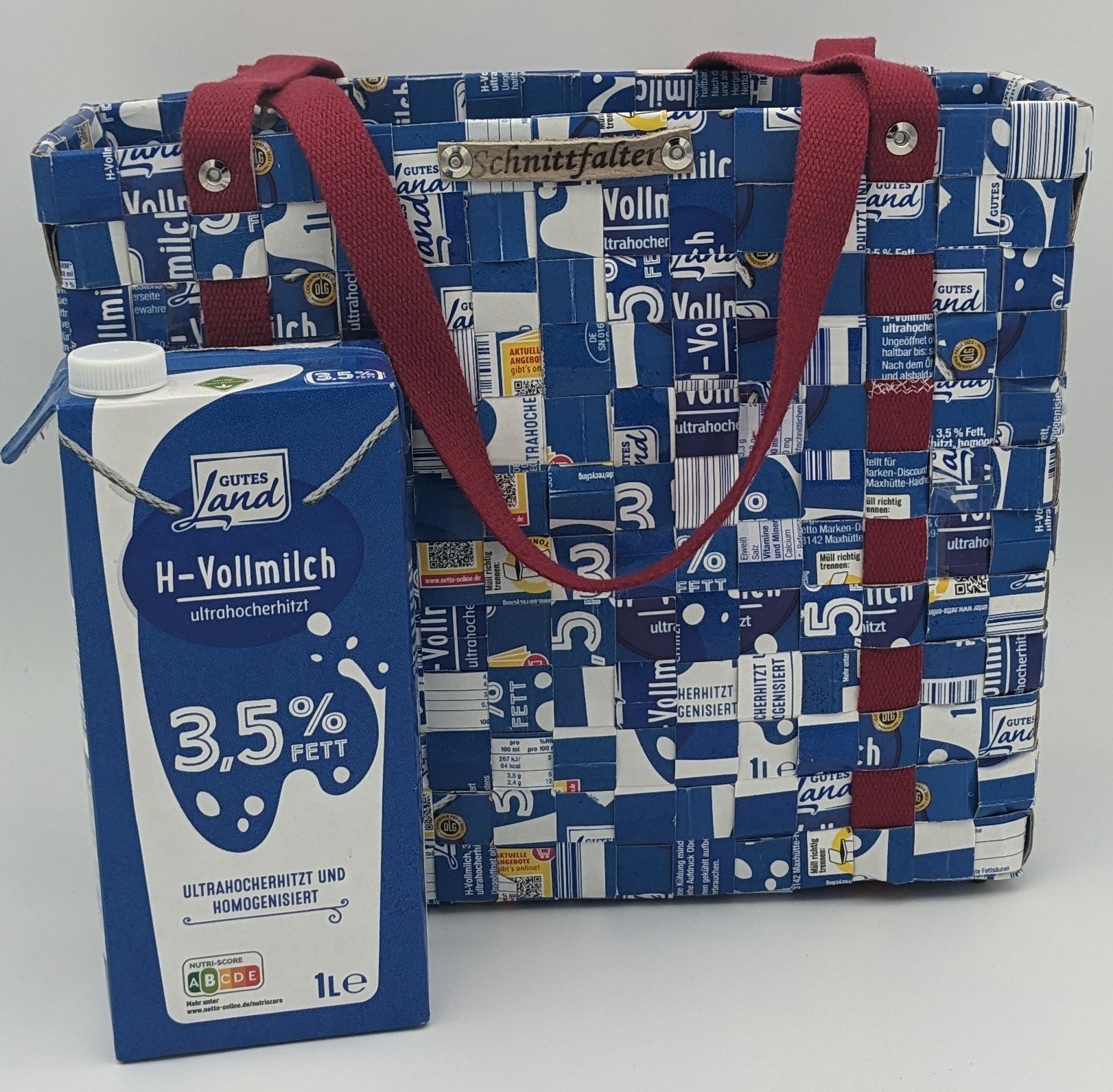 Diese handgefertigte Tasche ist sorgfältig aus gereinigten und geflochtenen Milchkartons der Marke "Gutes Land" hergestellt. Das robuste Material wurde zu einem modernen Design verarbeitet, das nicht nur ein Statement für Umweltbewusstsein setzt, sondern auch im Alltag überzeugt.