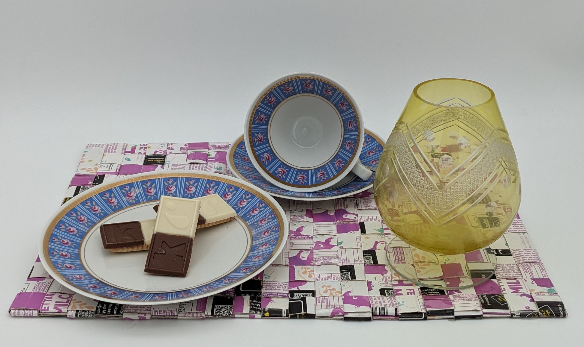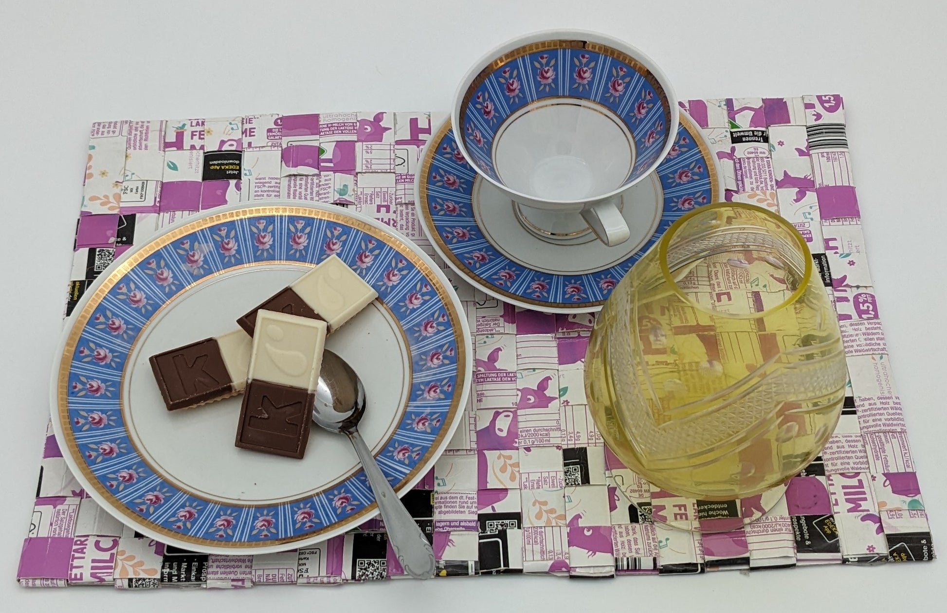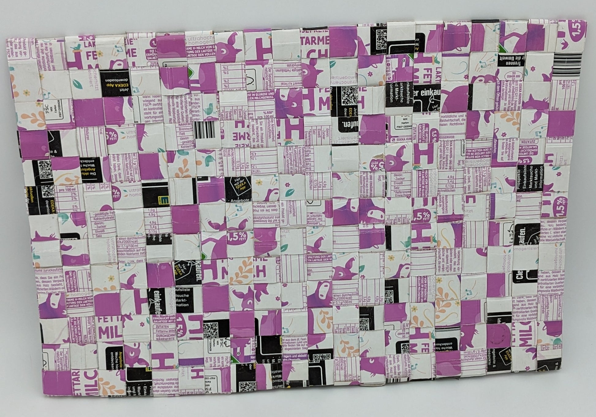 Dieses Platzdeckchen wurde aus fliederfarbenen Tetrapacks gefertigt und ist beidseitig geflochten. Es besticht durch seine kreative Handarbeit und nachhaltige Herstellung, die eine umweltfreundliche Alternative zu herkömmlichen Tischdekorationen bietet.