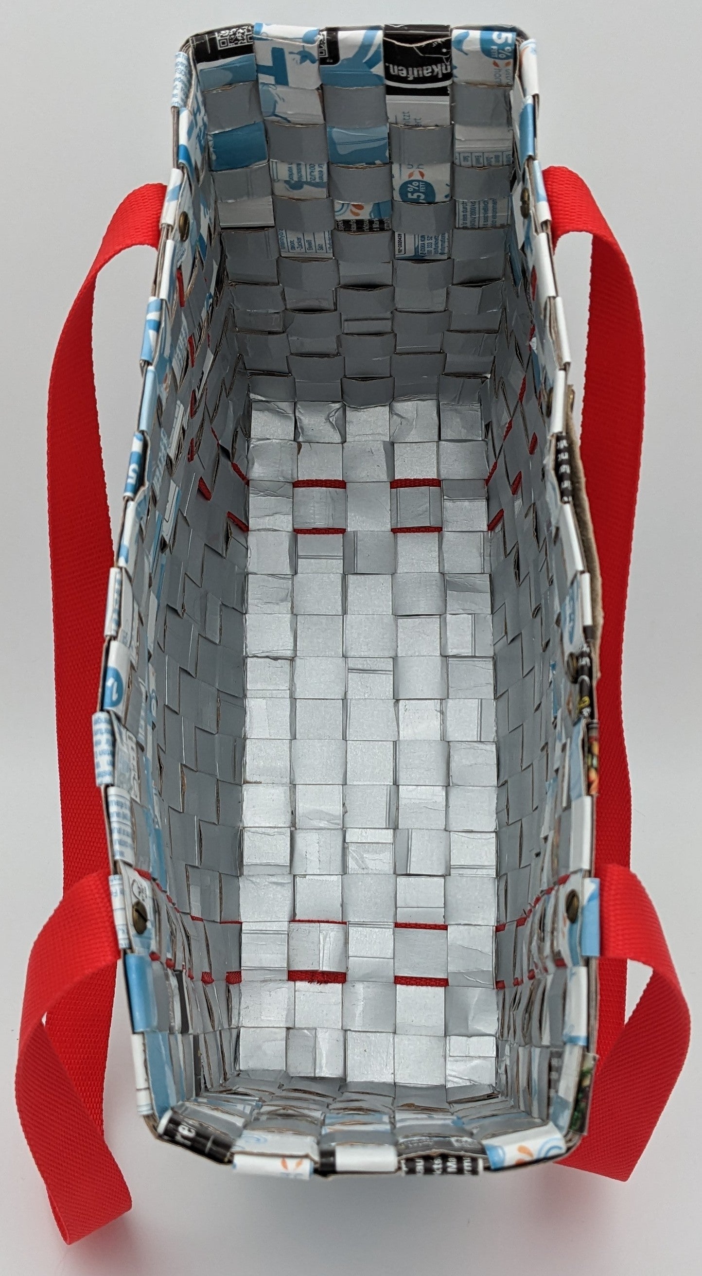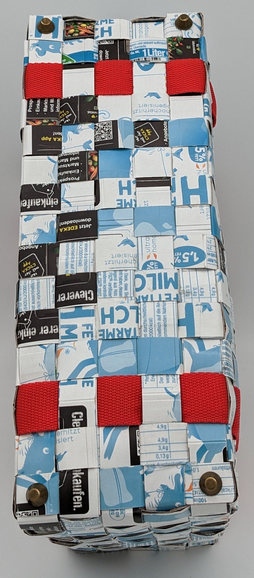 Diese handgeflochtene Einkaufstasche aus hellblauen Milchtetrapacks vereint stilvolles Design und Nachhaltigkeit. Das kräftige, umlaufende rote Gurtband setzt einen farblichen Akzent und sorgt für Stabilität. Dank der Taschenfüße bleibt die Tasche selbst nach einem größeren Einkauf formstabil und lässt sich bei Bedarf leicht wieder in Form bringen. Jede Tasche ist ein Unikat und wird in liebevoller Handarbeit gefertigt, perfekt für umweltbewusste Shopper.