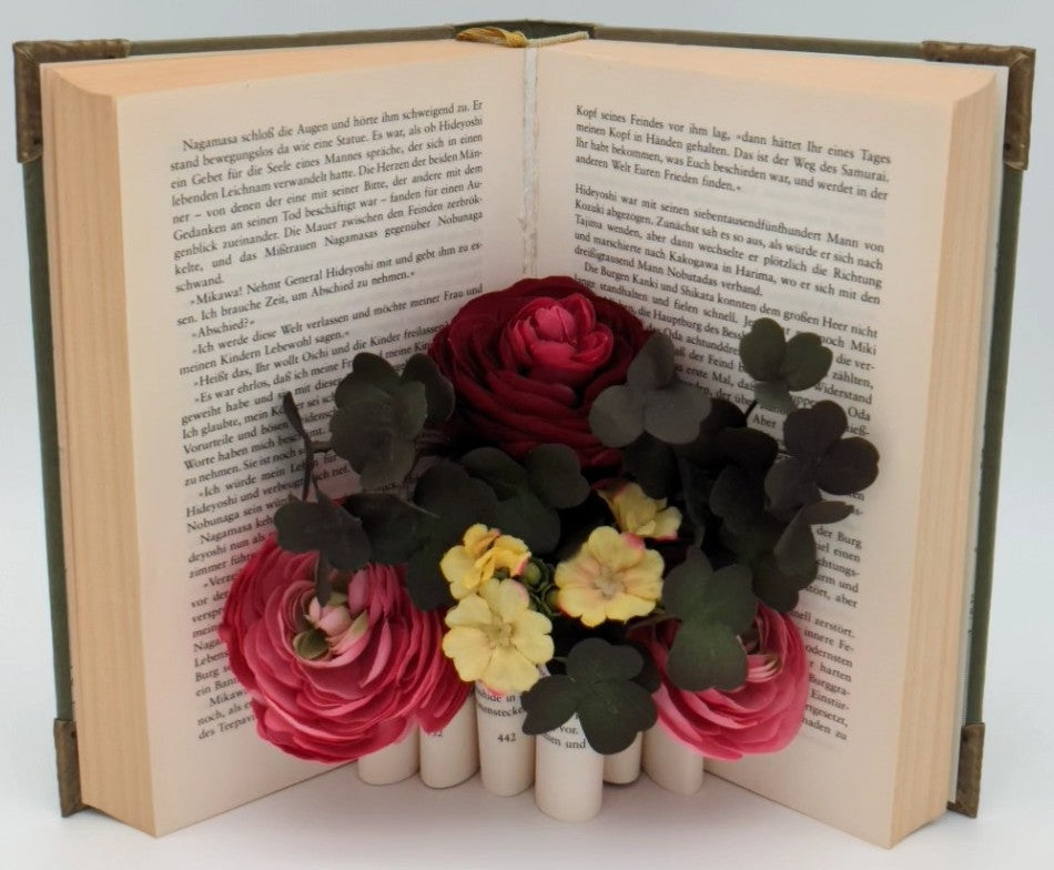 Tauchen Sie ein in die Welt der Buchfaltkunst und entdecken Sie dieses liebevoll gestaltete Unikat: Ein ausrangiertes Buch, das statt in der Tonne zu landen, nun als kunstvolle Dekoration erstrahlt. Die gefalteten Seiten bilden eine elegante Kulisse für farbenfrohe Ranunkelblüten, die harmonisch in Szene gesetzt sind. Dezente Buchecken verleihen dem Ganzen einen stilvollen Abschluss und schützen gleichzeitig die Kanten.
