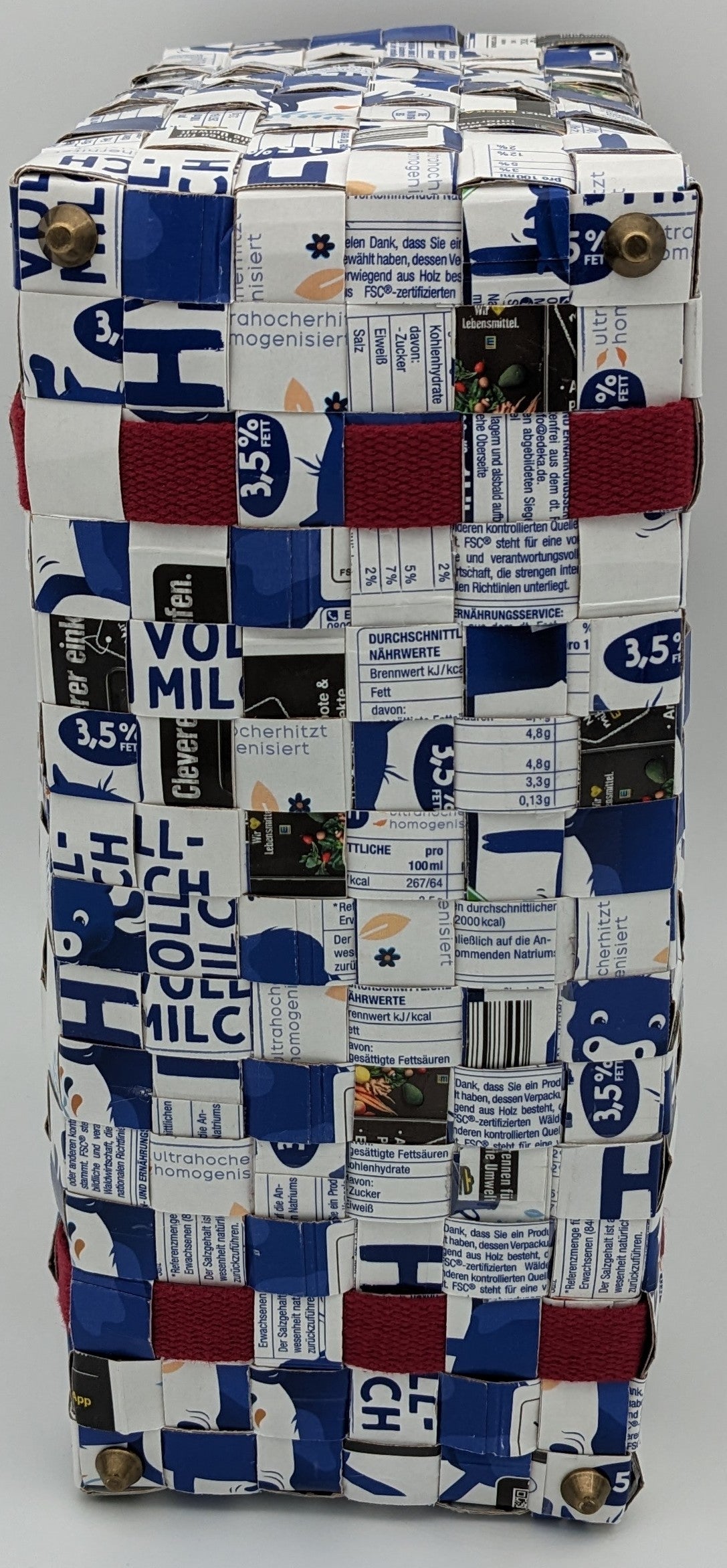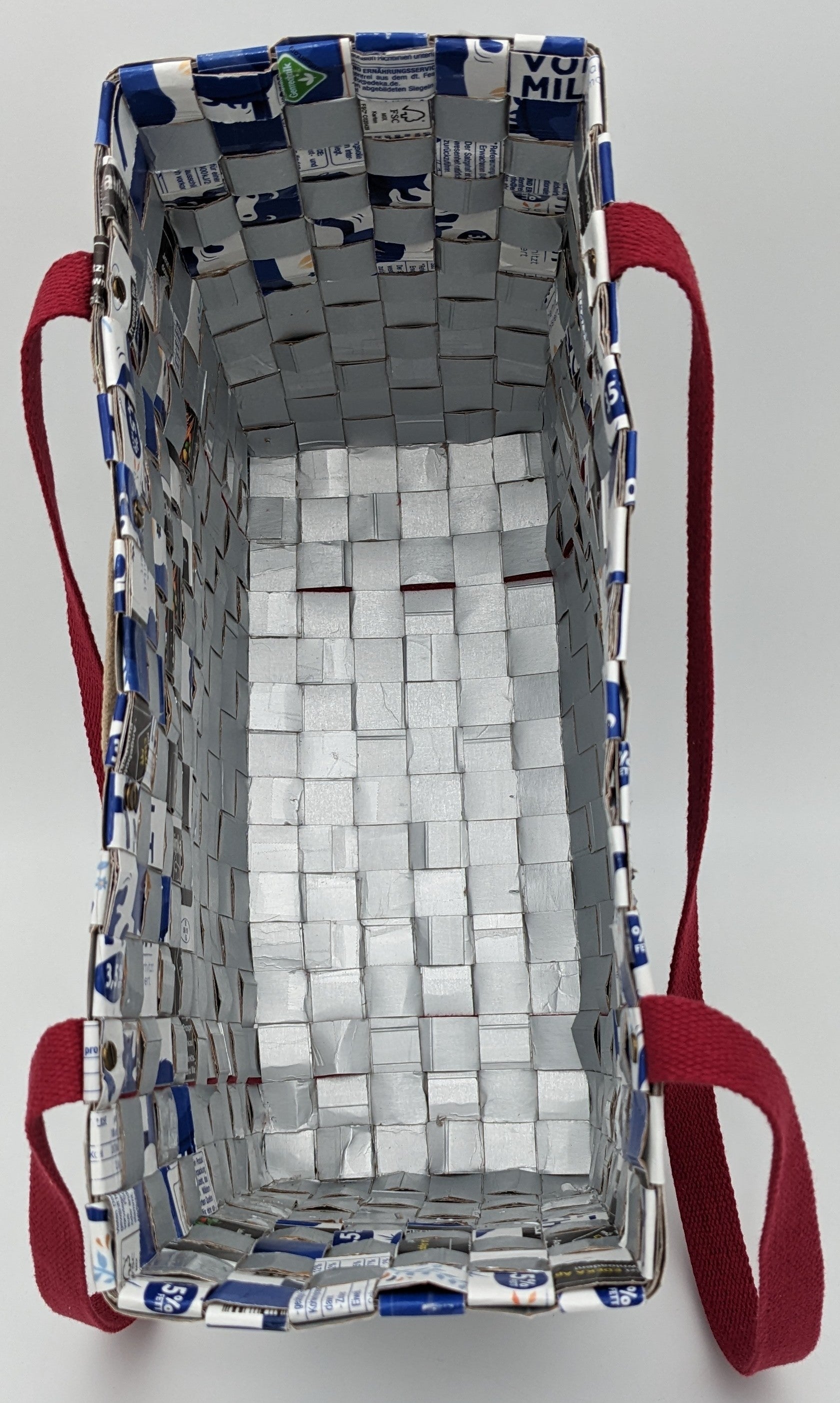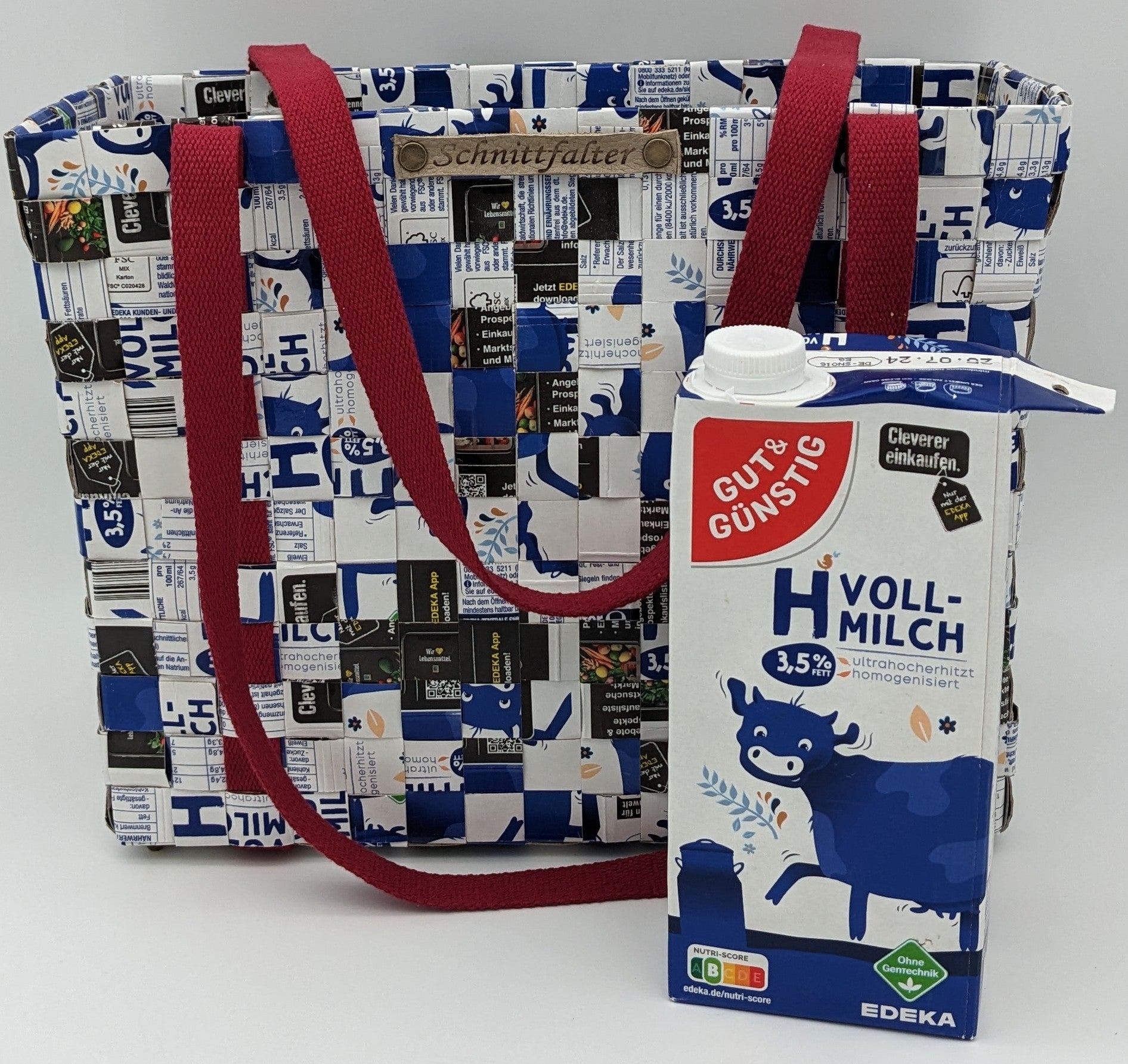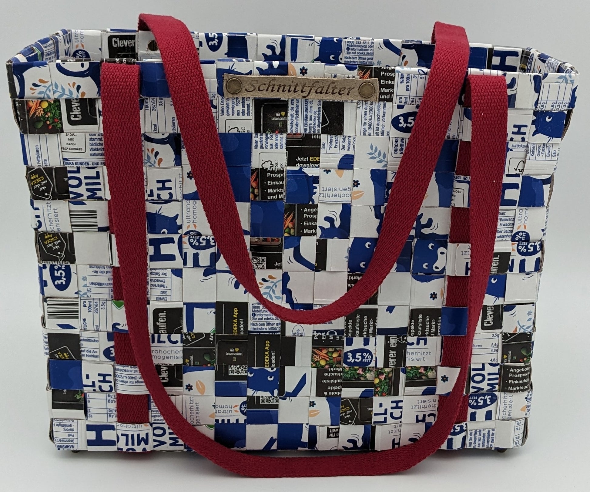 Upcycling-Einkaufstasche aus Tetrapack-Milchtüten-mit bordeaux-farbenem Gurtband