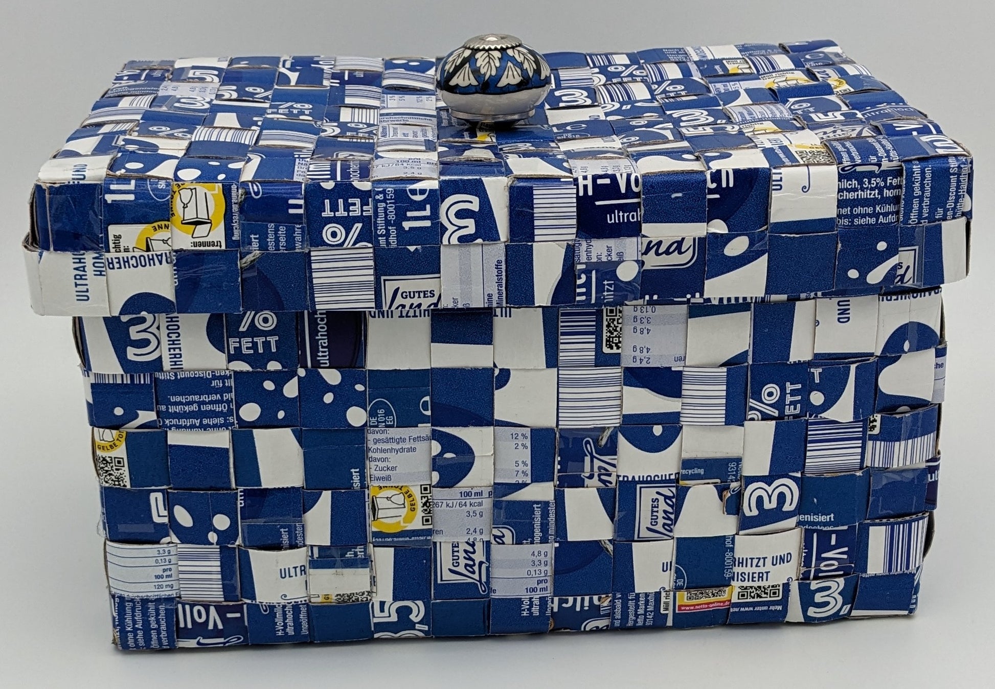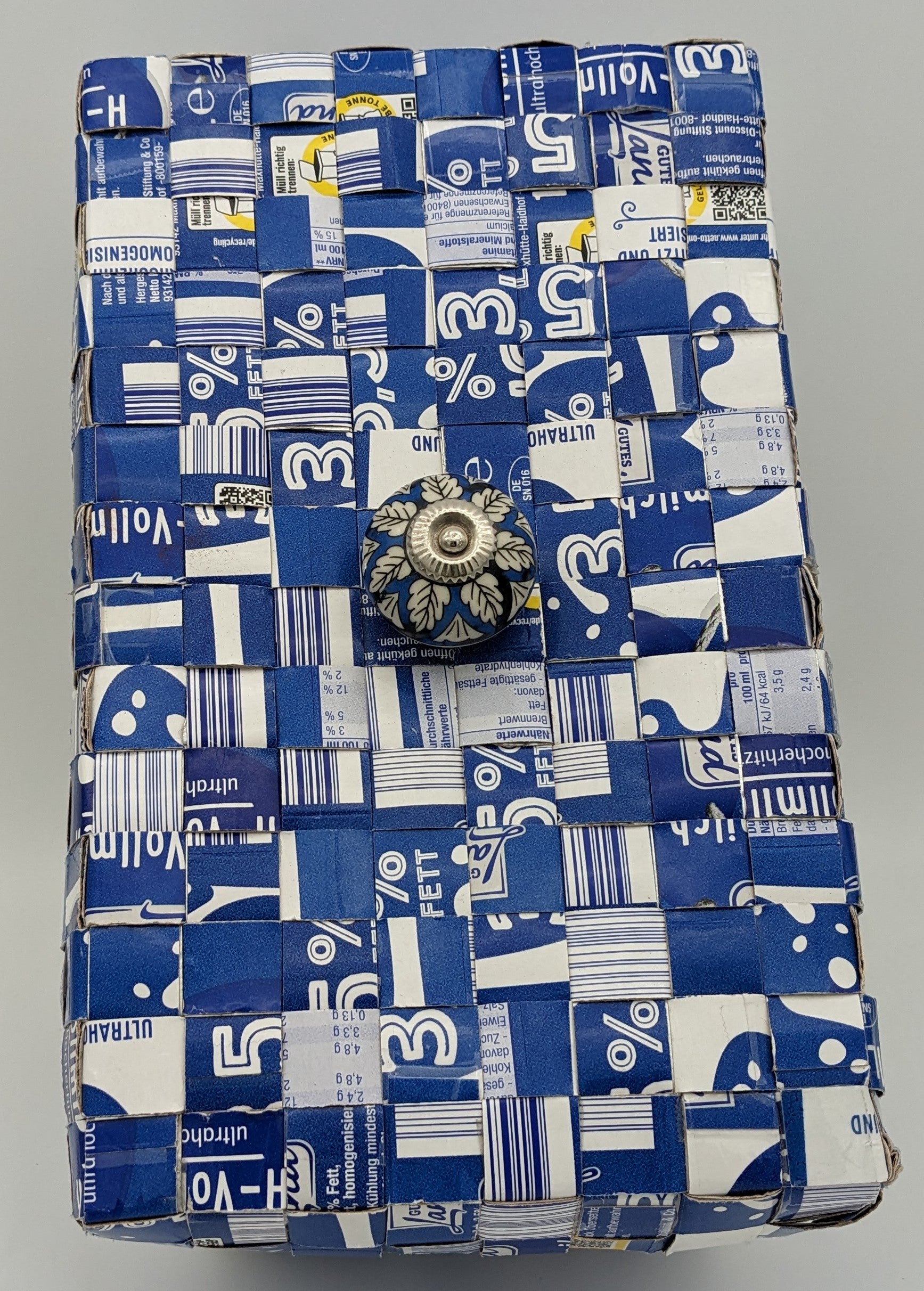 Upcycling-Utensilo aus Milchtüten mit Deckel und Keramikknauf