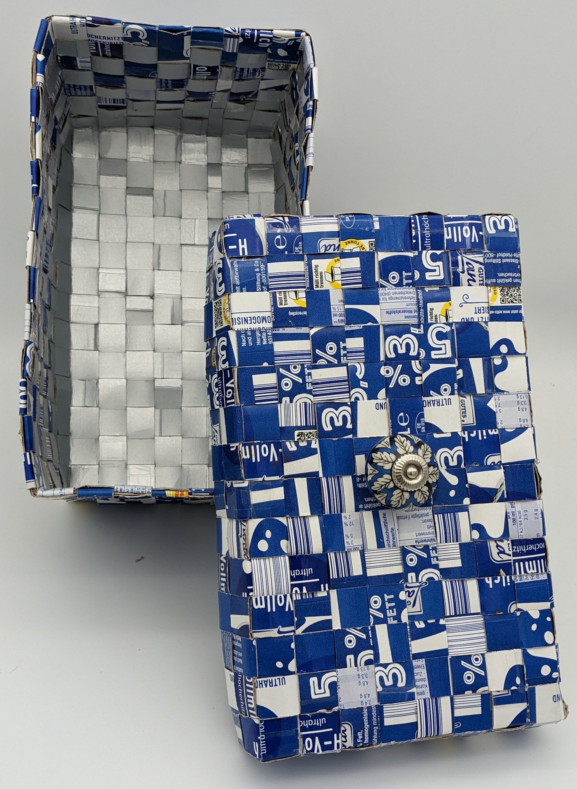 Dieses einzigartige Utensilo ist nicht nur ein echter Hingucker, sondern auch ein praktisches Organisationstalent. Gefertigt aus geflochtenen Milchtüten, kombiniert es Nachhaltigkeit mit kreativem Design. Der passende Deckel mit einem eleganten Keramikknauf sorgt dafür, dass der Inhalt sicher und ordentlich verstaut ist.